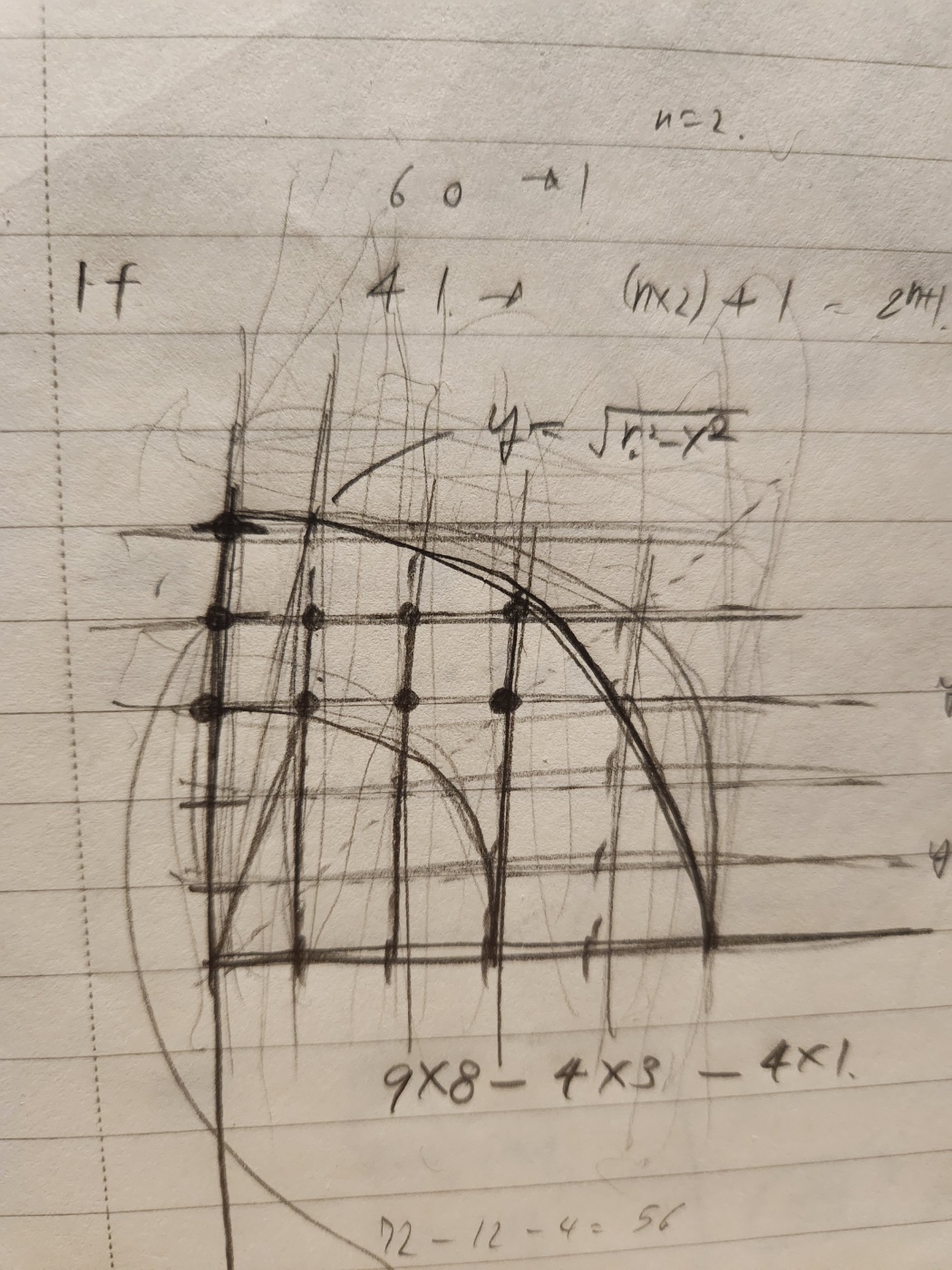 "사분면 전체말고 하나의 사분면에서 격자점을 센 뒤에 4를 곱하자" 라는 아이디어까지는 도달하였으나