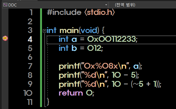 여기서 012는 접두사 0으로 인해 8진수로 인식되며, b에는 십진수 10이 할당된다.