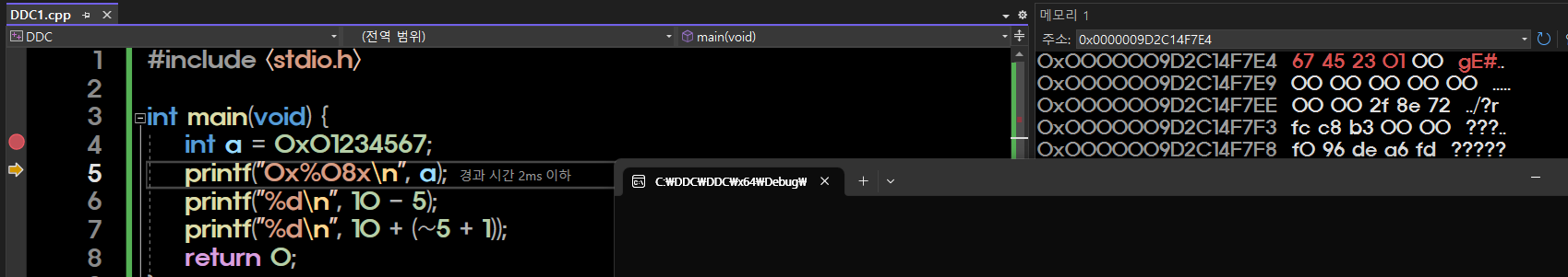 위와 같은 코드를 디버그해보자.(4번줄 클릭후 f5).